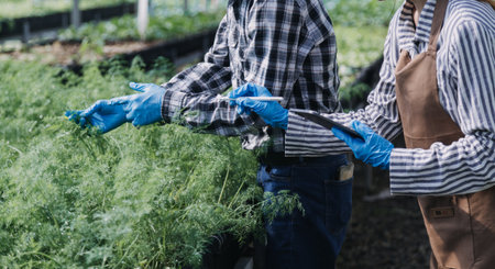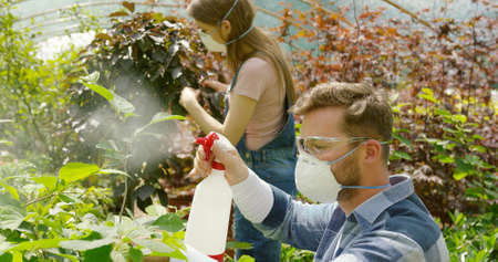 Male and female professional gardeners spraying fertilizer on plants while working in hothouse.