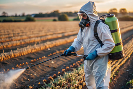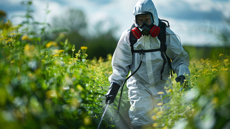 A farmer wearing protective gear while spraying pesticides on a green field