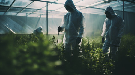 Expert Gardener Tending to Greenhouse Plants. Expert in hazmat suit caring for greenhouse crops.