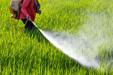 farmer spraying pesticide in the rice field