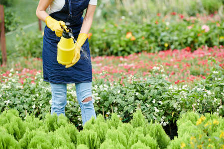 Close up of agricultural engineer spraying fertilizer over green sprouts while working in plant nursery, copy space