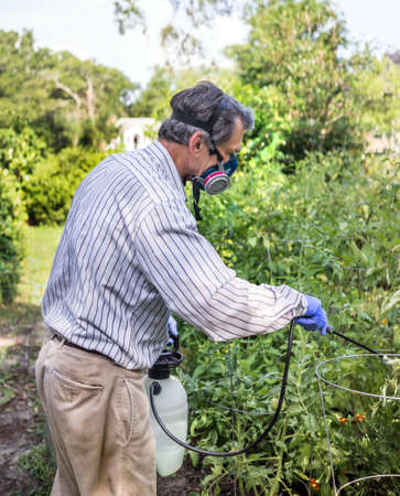 Man in garden spraying tomatoes with insecticide