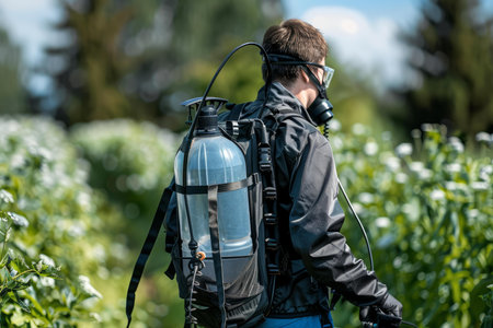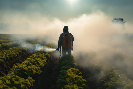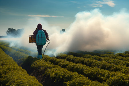 A man wearing a backpack walks through a lush green field on a sunny day., person fumigating field with pesticide or insecticide, AI Generated