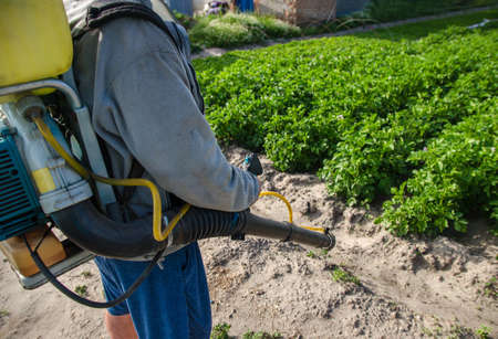 A farmer sprinkles a potato plantation with an antifungal chemical. Use chemicals in agriculture. Fight against fungal infections and insects. Agriculture and agribusiness, agricultural industry.