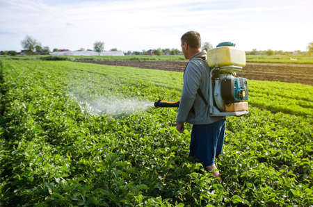 Gardener poisons pest insect in the garden. Farmer man spraying potatoes with poison against colorado potato beetle. Sprinkles with sprayer.