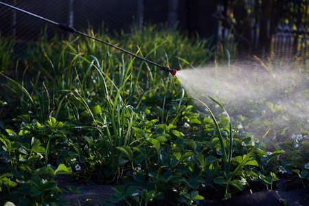 Spraying of spring early strawberries in the garden. Spring works at sunset