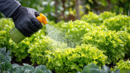 A gardener hand sprays water on fresh green lettuce in a vibrant garden, promoting growth and health through sustainable practices and maintaining vegetables.