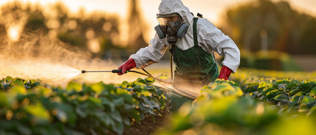 Agricultural worker in protective gear applying chemical treatment to crops during golden hour.