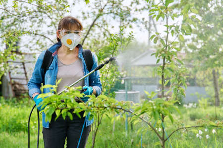 Woman with backpack garden spray gun under pressure handling bushes roses