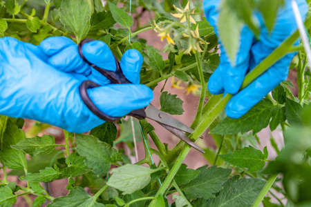 Proper pruning suckers on tomatoes over the first sheet in the greenhouse