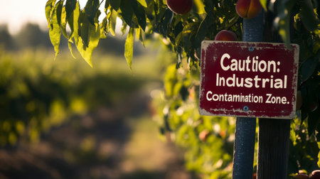 Red industrial contamination zone sign on a weathered post amongst fruit trees at sunrise. The sign is old and worn, with a blurred background of lush green foliage. Warm lighting suggests early morning.