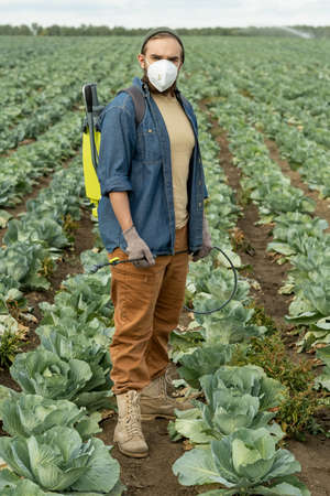 Male farmer with sprayer standing in cabbage field among long rows of plants