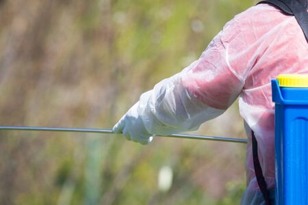 Worker in protective workwear spraying herbicide on ambrosia