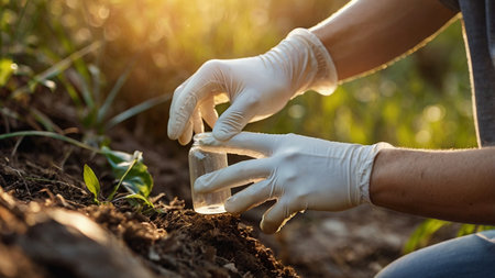 Close-up of scientist in white coat processing young plants with chemicals during his work in the lab