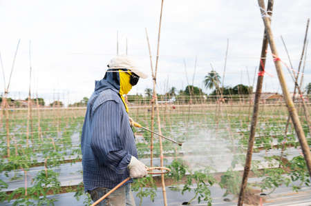 Gardening concept a young male farmer spraying a chemical pesticide for preventing the crops from the pests.