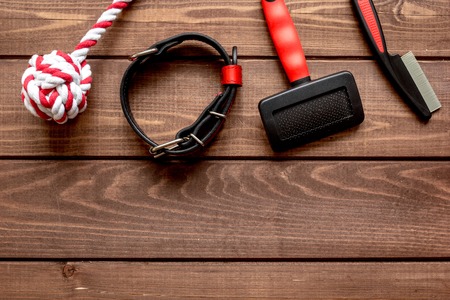 concept pet care and training on wooden background top view.