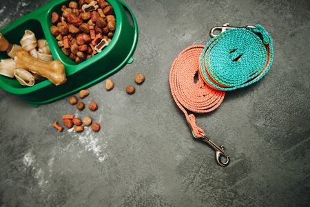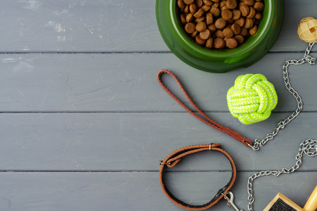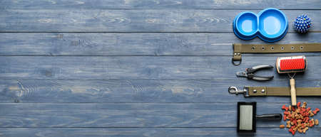 Top view of dog care and feeding accessories. Flat lay. Space for text.