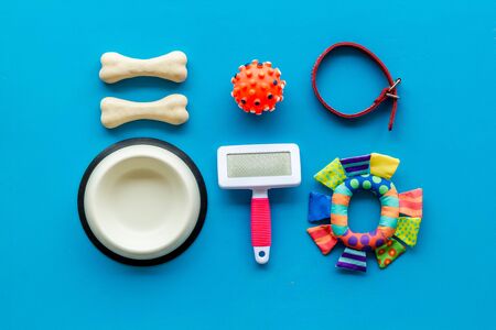 Pets accessories like bones, collar and bowl on blue background top view flat lay