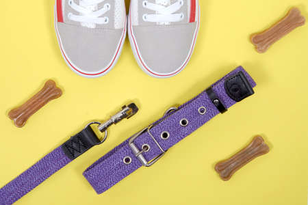 Accessories for Pets. Collar, leash, treat, shoes for walking with a dog, on a yellow background top view