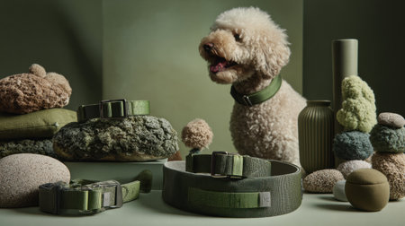 A dog stands beside eco-friendly pet accessories in various natural textures on a table. The green colors create an ethical lifestyle look.
