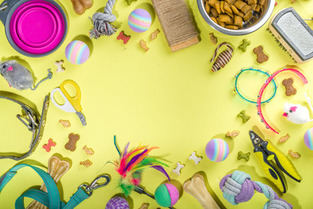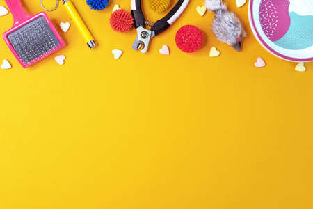 Pet care and training concept. Frame of grooming accessories for cat and dog on yellow background. Flat lay, top view.
