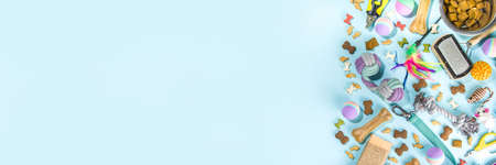 Pet food and accessories, various cat, dog, domestic animals food, toys, treats, utensils. Zoomarket and pet store, online shopping, pet care concept, flatlay banner top view copespace