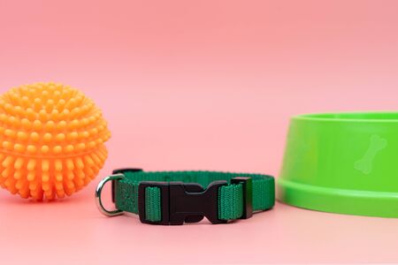 Pet collar and rubber toy with bowl on pink background