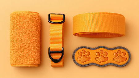 high quality e-commerce style photo of orange pet accessories including a collar, strap, and paw print embossed accessory, arranged neatly on a solid background for product display. ai generated.