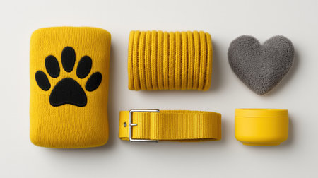 e-commerce style product image of a yellow pet accessory set including strap, towel, paw print design, and grooming items, arranged neatly for online shop presentation. ai generated.