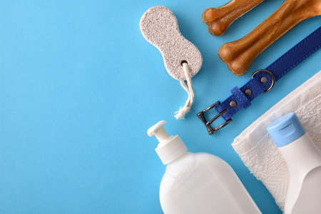 Dog coat care products on blue background. Top view. Horizontal composition.