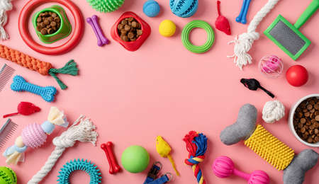 Pet care concept, various pet accessories, toys, balls, brushes on pink background with copy space