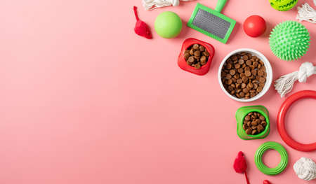 Pet accessories top view. Dry dog and cat food with toys