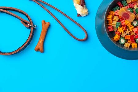 Treats and toys for dogs on blue background close up