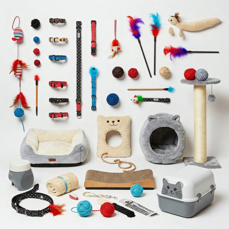 Pet accessories and grooming tools set with toys, top view