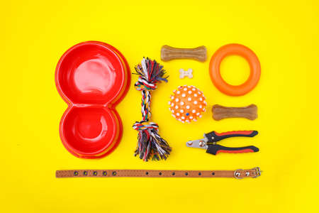 Set of accessories for the dog on a yellow background. Red bowl, collar, ball, goodies. Caring concept. Canine background. Top view, flat lay.
