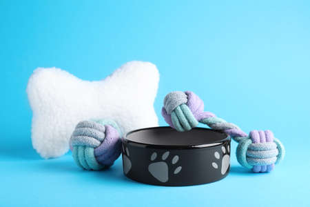 Feeding bowl and toys for pet on light blue background