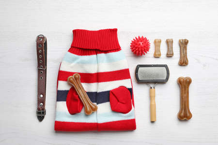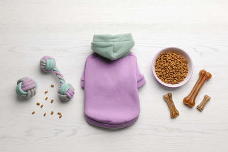 Flat lay composition with clothes, food and accessories for dog on white wooden table