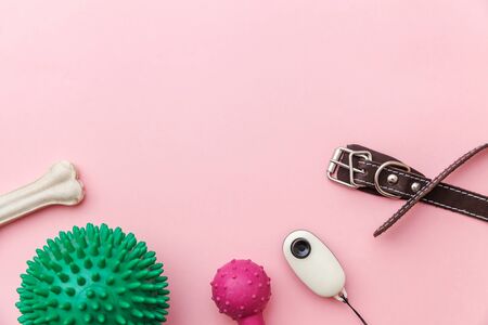 Pet care and animals concept. Toys and accessories for dog playing and training isolated on pink pastel trendy background. Simple flat lay with ball bone clicker and collar. Top view copy space