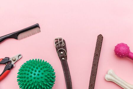 Pet care and animals concept. Toys and accessories for dog playing and training isolated on pink pastel trendy background. Flat lay with ball bone clicker comb claw cutter collar. Top view copy space