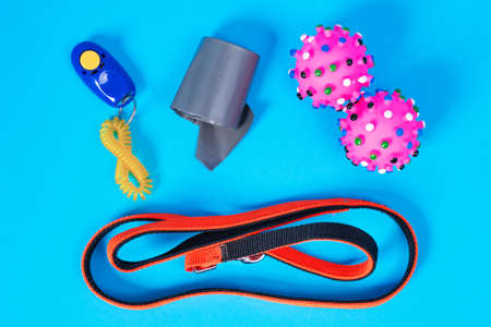 Top view of orange collar, two pink rubber balls, knotted homemade dried treats, eco friendly bag gathering with dog poop or leash on a blue background. set for walk, training, obedient. Pet supplies