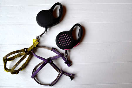 Leashs and collars for terrier dog. Pet's staff.