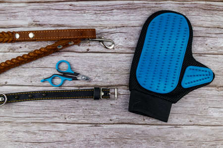 Dog accessories on wood background. Blue rubber grooming glove, claw clipper, brown leather leash and spiked collar for dog on wooden background. Top view. Pet care concept