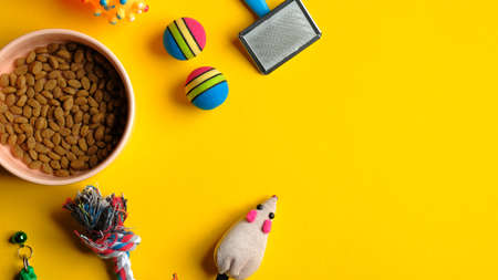 Pet care and training concept. Top view bowl of dry food and accessories for cat and dog on yellow background.