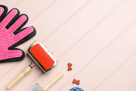 Pet care accessories on light wooden background