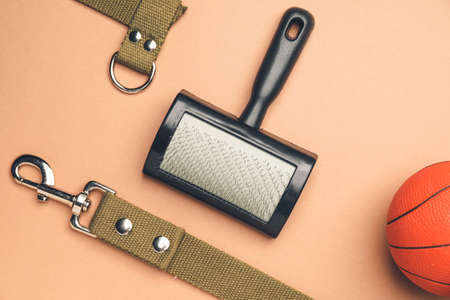 Pet brush, leash and ball on color background