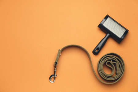Pet brush and leash on color background