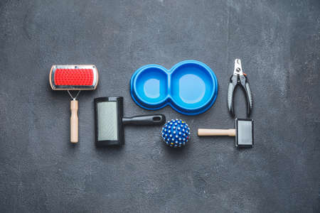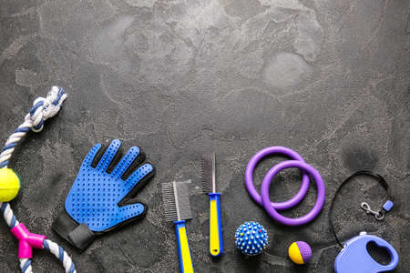 Different pet care accessories on dark background