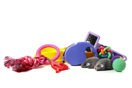 Pet care accessories on white background