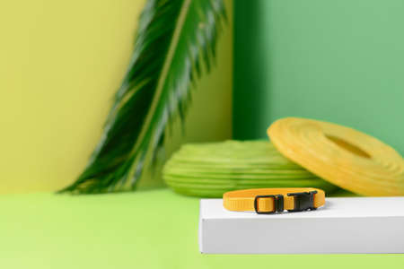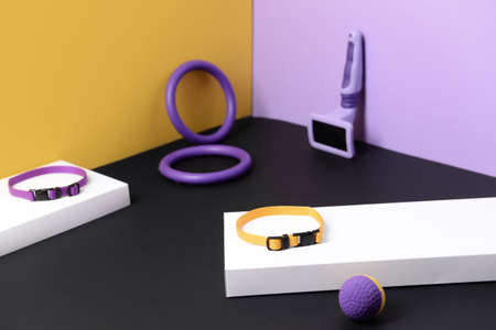 Creative composition with collar for pet on color background