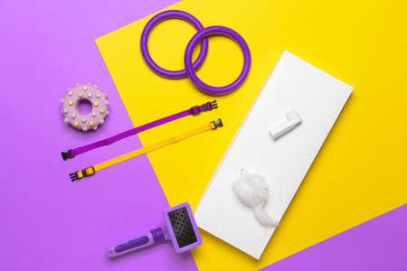 Creative composition with pet toys and accessories on color background